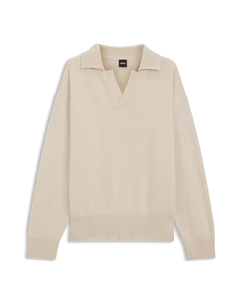 Knitted in temperature-regulating virgin wool for year-round comfort, this regular-fit BOSS Menswear sweater is a solid investment. Clean open collar.
