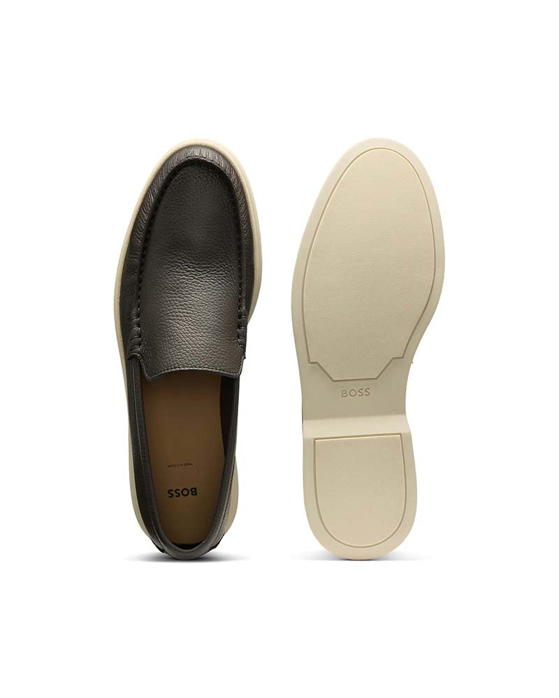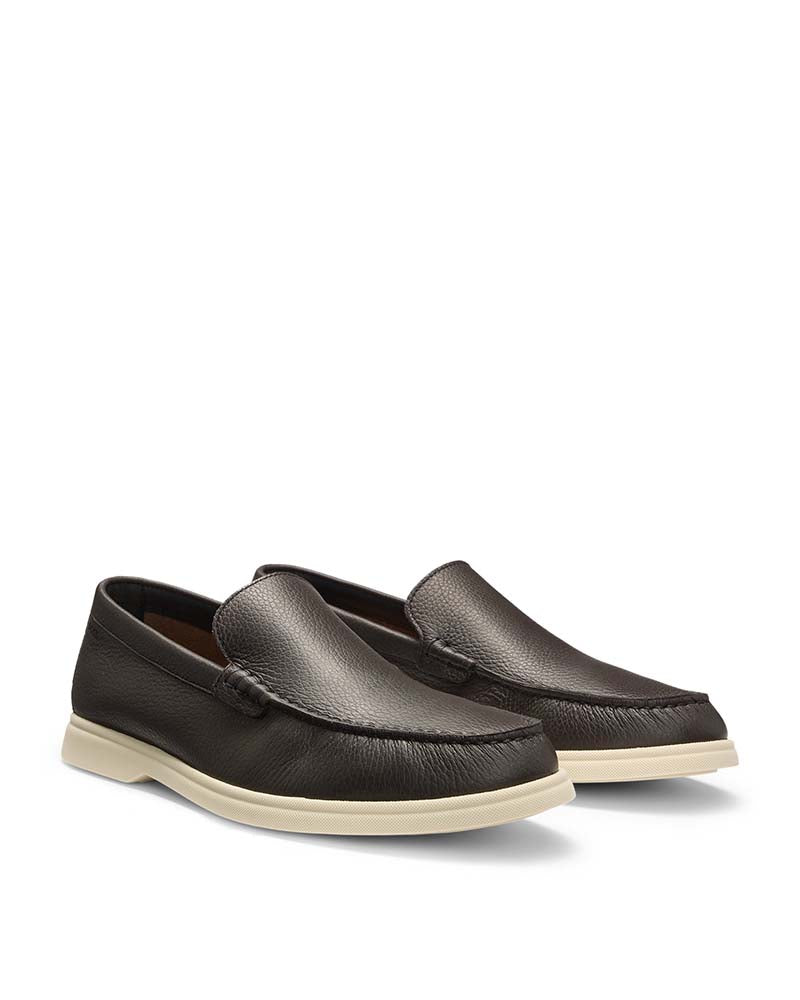 Slip-on moccasins by BOSS Menswear. Crafted in Europe from tumbled leather, this pair has a durable outsole and subtle logo accent.