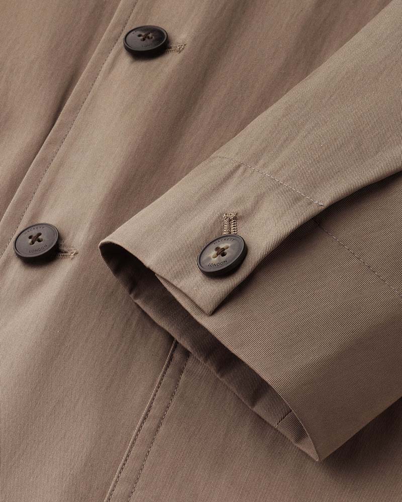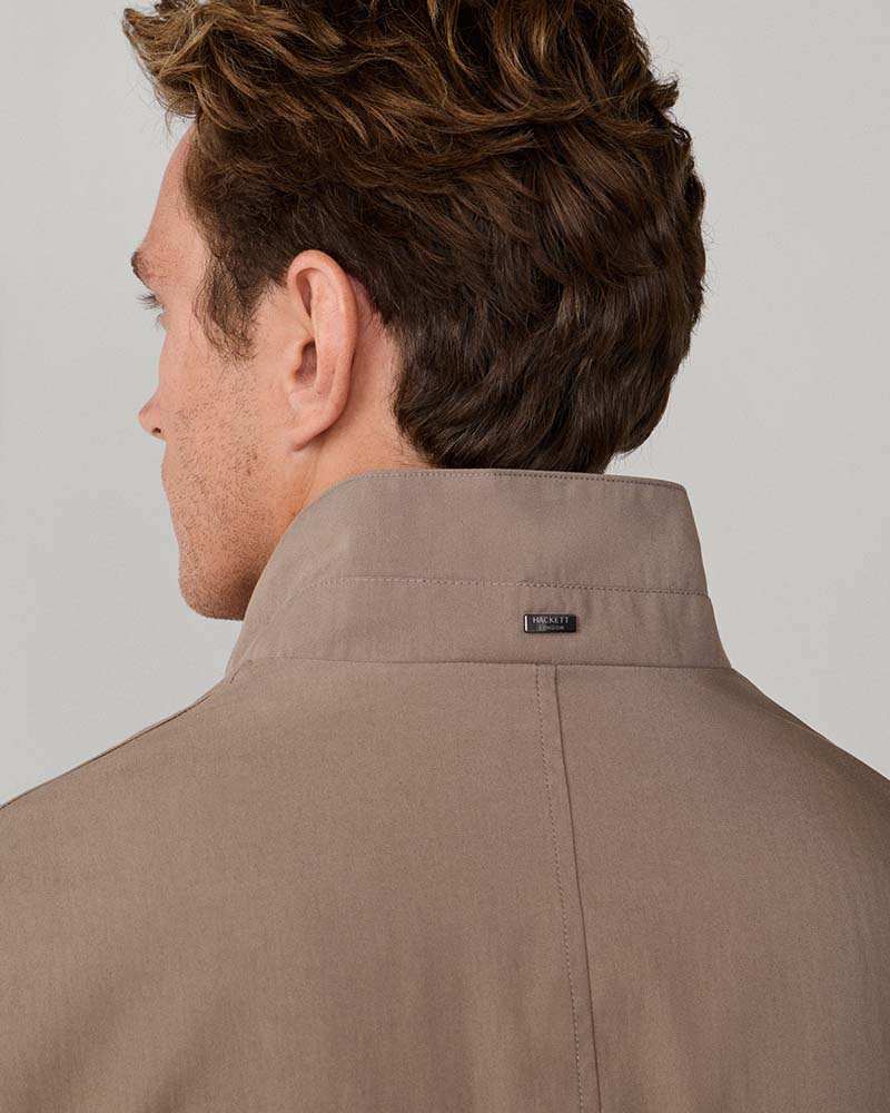 Features are: Stand collar design. 3/4 single button front fastening. Half lined. Lower pockets. Elastic back detail waist and button cuff.