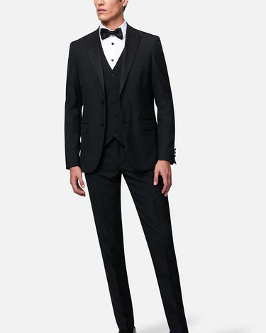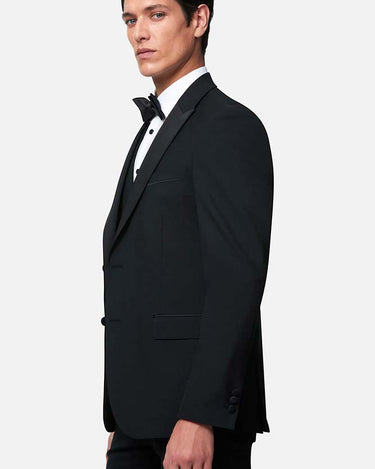 Ideal for formal events and smart dinners, this tuxedo is tailored from luxurious fabrics in a neat and tapered profile. It has satin peak lapels that lend it a retro quality, while broadening your shoulders.