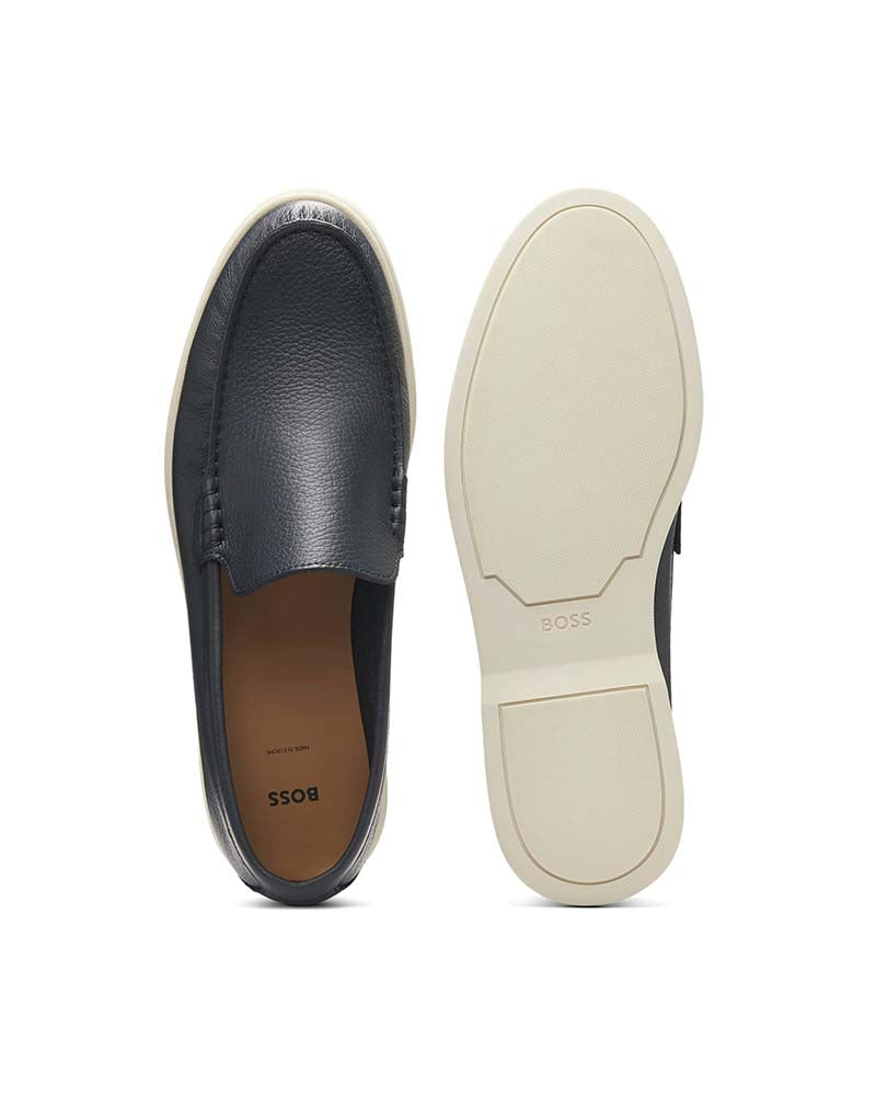 Slip-on moccasins by BOSS Menswear. Crafted in Europe from tumbled leather, this pair has a durable outsole and subtle logo accent.