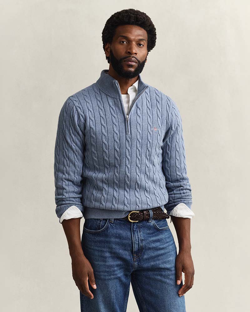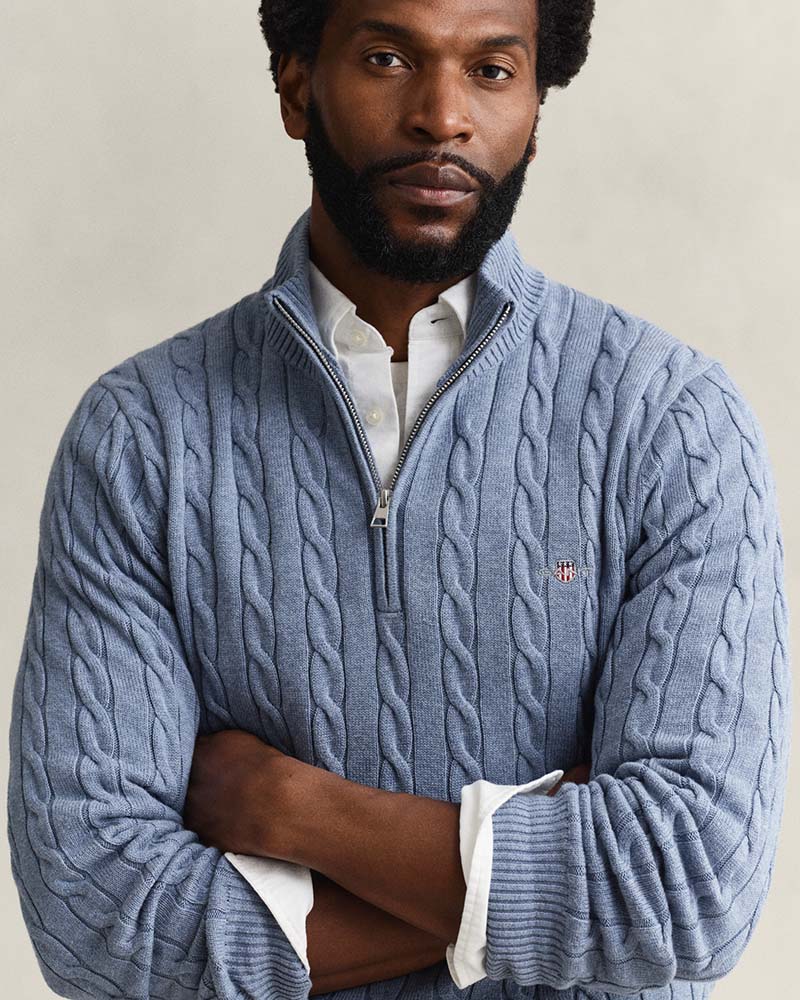 A preppy piece for any modern wardrobe, this Gant sweater is designed with traditional cable-knitting. Crafted from 100% cotton, it has a regular fit with a sporty half-zip collar, ribbed detailing at the hem and cuffs, and a Gant shield graphic embroidered at the chest. Style with denim and tailoring.