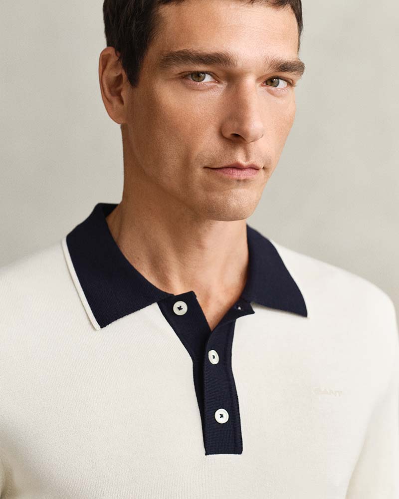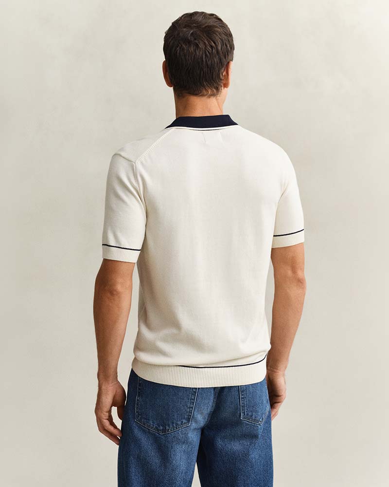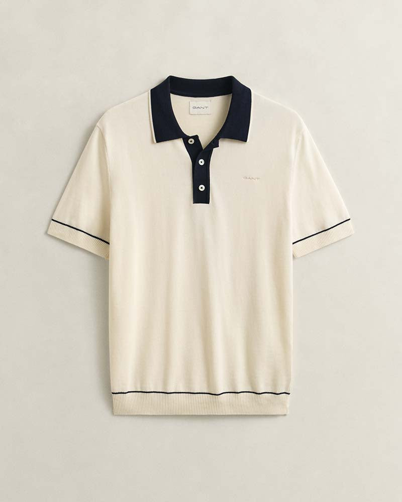 his Gant short-sleeved sweater is knitted from a cotton-modal blend for a smooth, soft feel. Designed for a regular fit, it features a polo collar and placket in a contrast colour with stripe detailing, echoed at the hem and cuffs. Ribbed finishes add structure, while imitation mother-of-pearl buttons and embroidered branding at the chest complete the look.