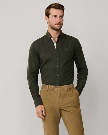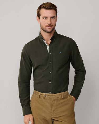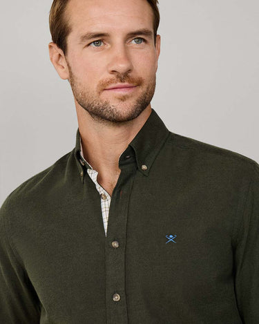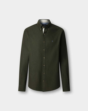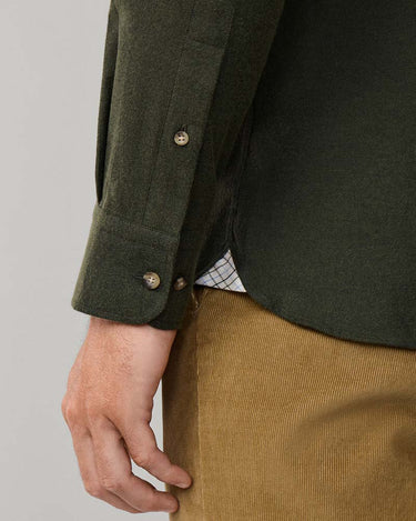 - Checked flannel trims at the placket, cuffs, and collar add seasonal detail