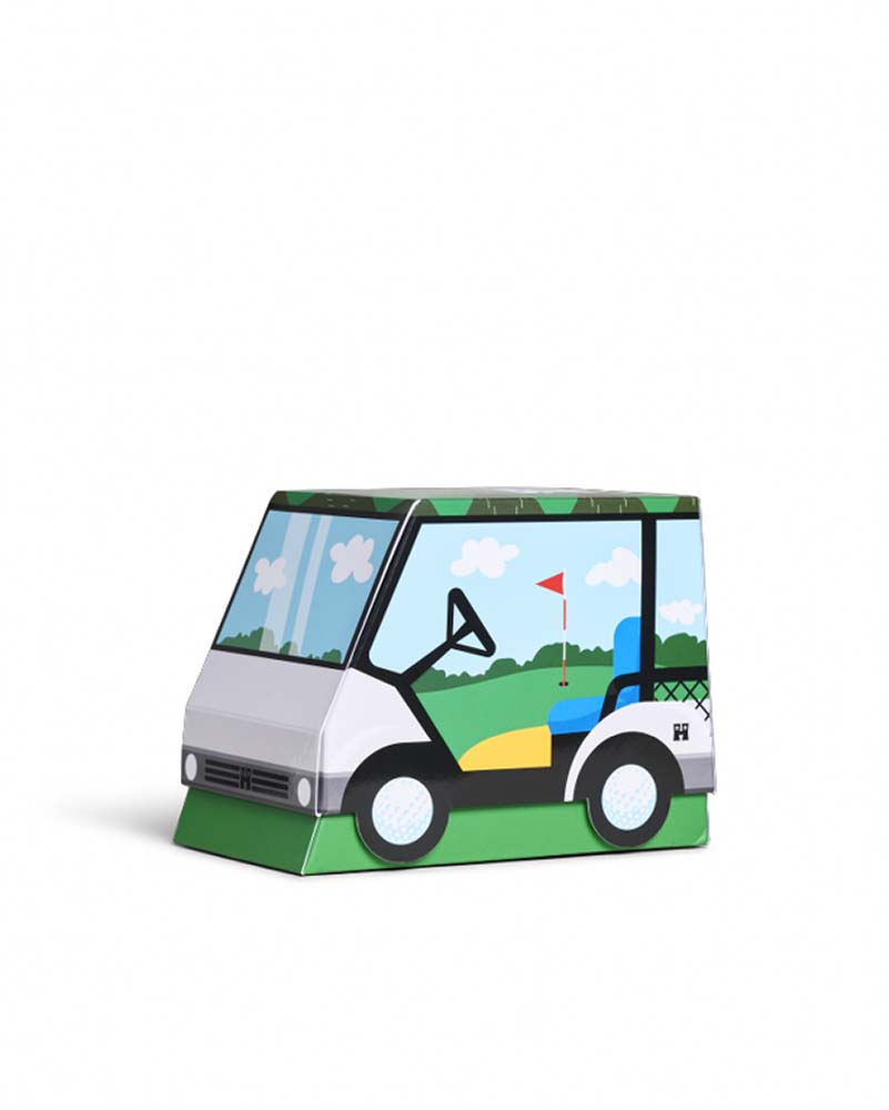 Tee off in style with the Happy Socks 3-Pack Golf Socks Gift Set, featuring three unique golf-inspired designs that are par-fect for any golf enthusiast. This fun gift set includes a scenic golf vista sock, a gold ball patterned sock, and a classy green and grey print sock, all packaged in a golf cart-shaped container. These novelty socks let golf lovers showcase their passion for the game. Whether on or off the course, these socks are sure to drive a smile. Perfect gift for: the golf enthusiast in your life.